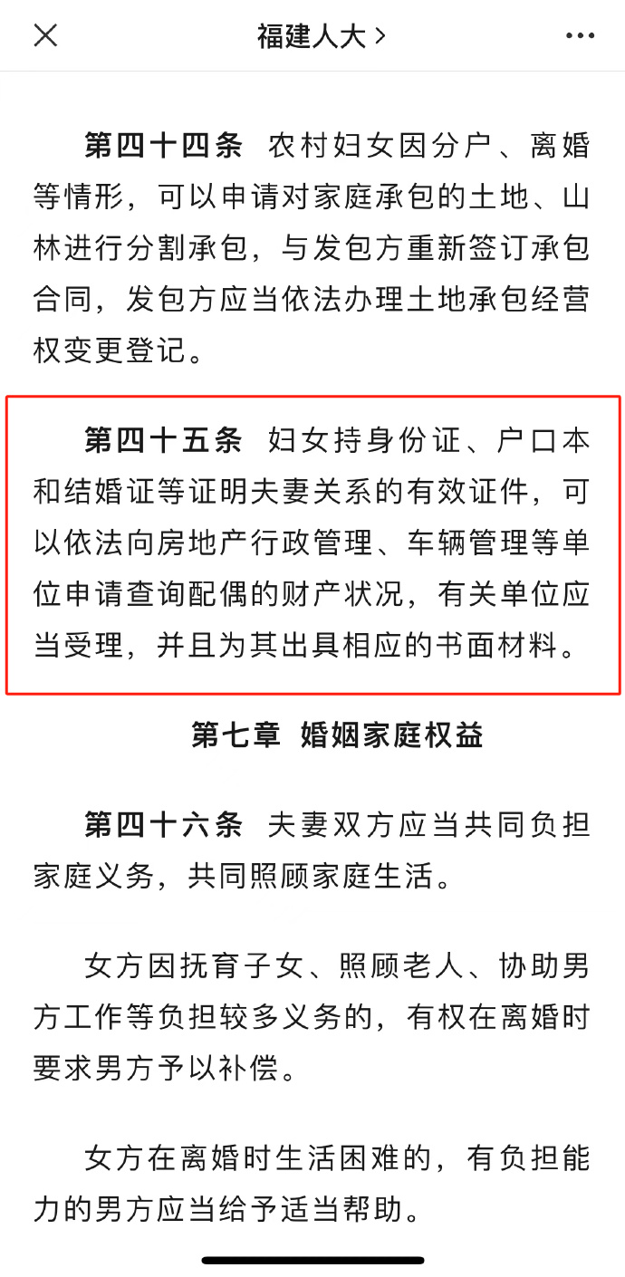 近日,福建省人民代表大会常务委员会公告,《福建省妇女权益保障条例》自2024年6月1日起施行。该条例第六章第四十五条明确,“妇女持身份证、户口本和结婚证等证明夫妻关系的有效证件,可以依法向房地产行政管理、车辆管理等单位申请查询配偶的财产状况,有关单位应当受理并且为其出具相应的书面材料”,引发公众热议。