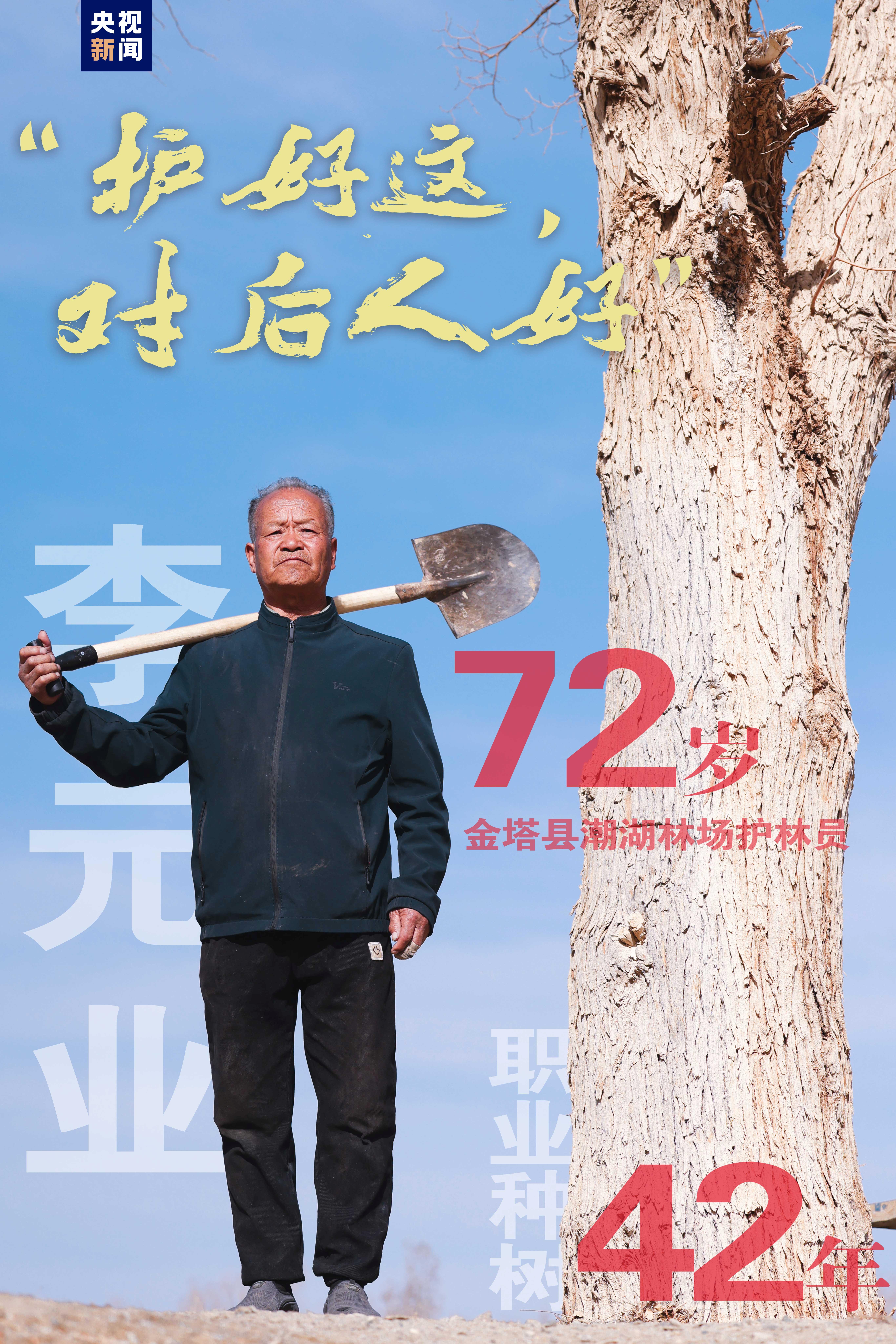 30岁时,外乡人李元业来到金塔,准备以放羊为生。但面前的沙丘每天都会变高一点,人和羊的指望就随着少一点,那时种树是人“必须活下去”的迫不得已。42年后,已逾古稀的护林员李元业每天都会走15000步以上检查林场火患,老人家的样子跟他种下的胡杨一样粗粝。关于种树护树,他这样说:“护好这,对后人好”。