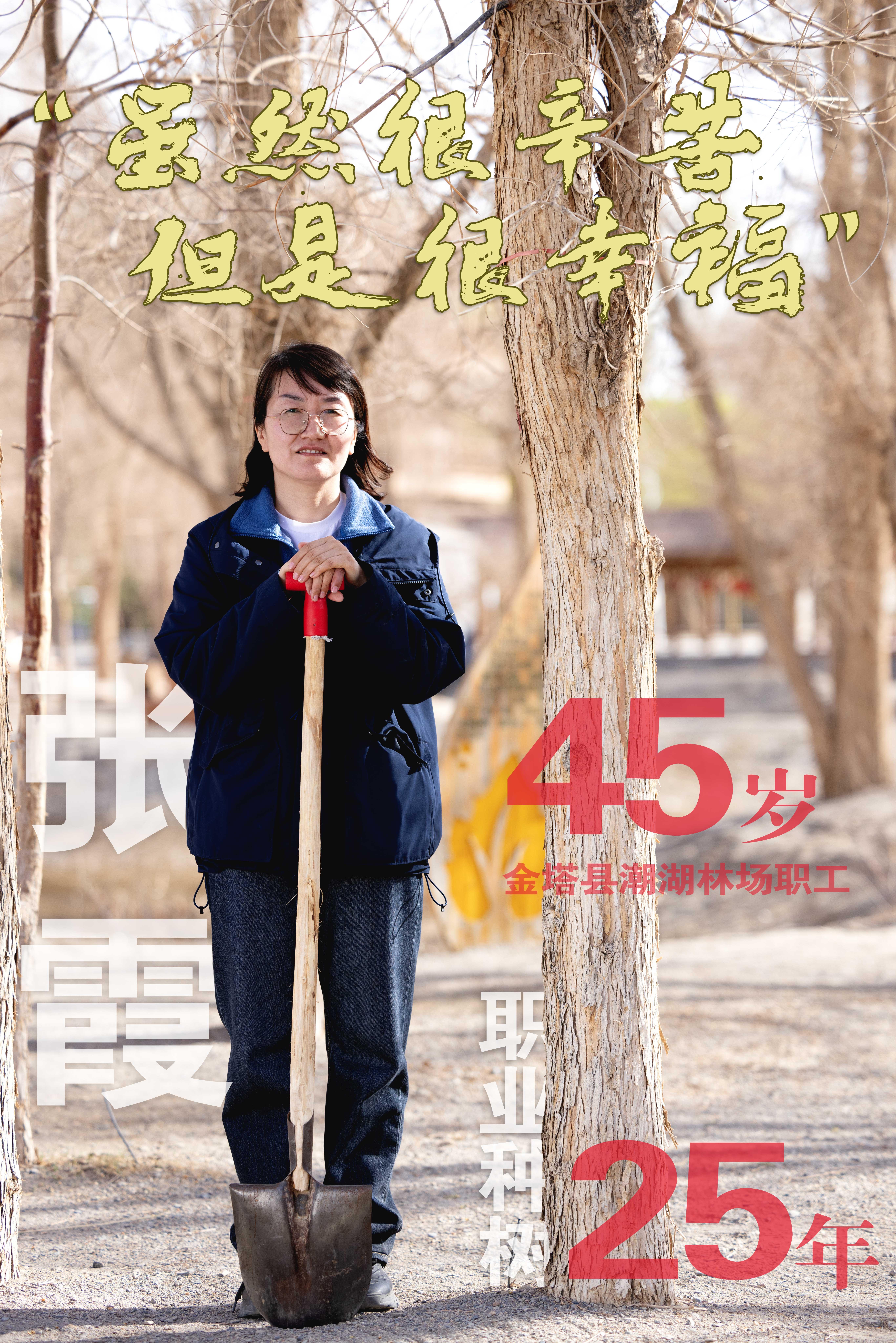 张霞是金塔县潮湖林场现任副场长,也是为数不多的林场女职工。谈起种树她滔滔不绝,精准又理性,像个AI。同时她也感性地把植树计入自己过去的25年美好青春——“虽然很辛苦,但是很幸福啊”。