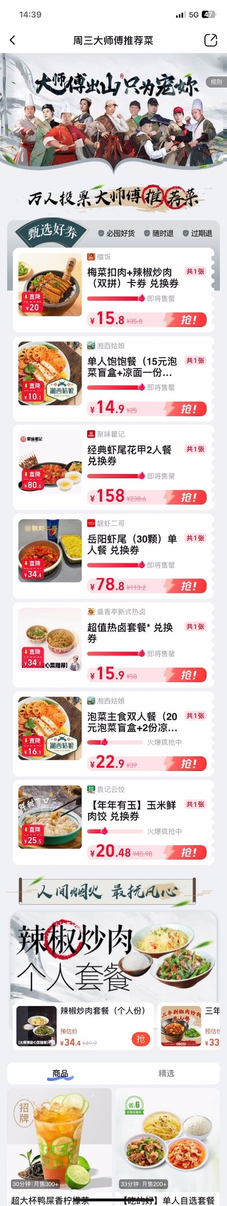 记者注意到,饿了么长沙大师傅专区不仅有10位大师傅推荐的10道“大师傅菜品”,还有专享的大师傅菜品团购折扣券。如,9.9元/份的梅菜扣肉和辣椒炒肉双拼卡、78.8元的岳阳虾尾双人餐、16.98元的玉米鲜肉饺兑换券等等。