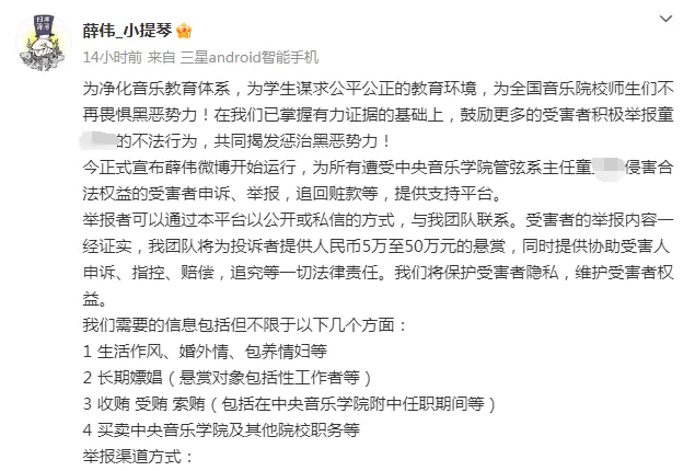 近日,一位账号简介为“中央音乐学院教授薛伟”的微博账号发帖称,公开悬赏征集同校管弦系主任童某某违法线索。