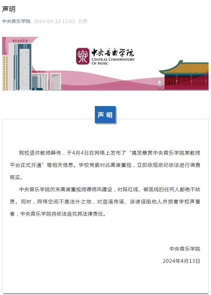 我校退休教师薛伟,于4月4日在网络上发布了“揭发悬赏中央音乐学院某教师平台正式开通”等相关信息。学校党委对此高度重视,立即依规依纪依法进行调查核实。