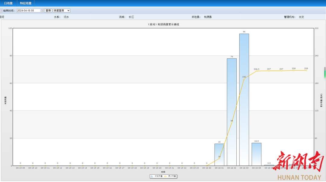 受中低层切变和增强的西南暖湿气流共同影响,4月16日凌晨,常德市桃源县东北部发生局部大暴雨过程。4月16日凌晨3点,时刻关注这场暴雨情况的常德水文中心水情科科长吴震中发现田河站降雨量暴增情况,立刻与桃源县水文局和田河水库管理所取得联系,确认降雨情况。凌晨4点,省水文中心水情值班室来电询问田河站降雨情况,要求尽快核实。