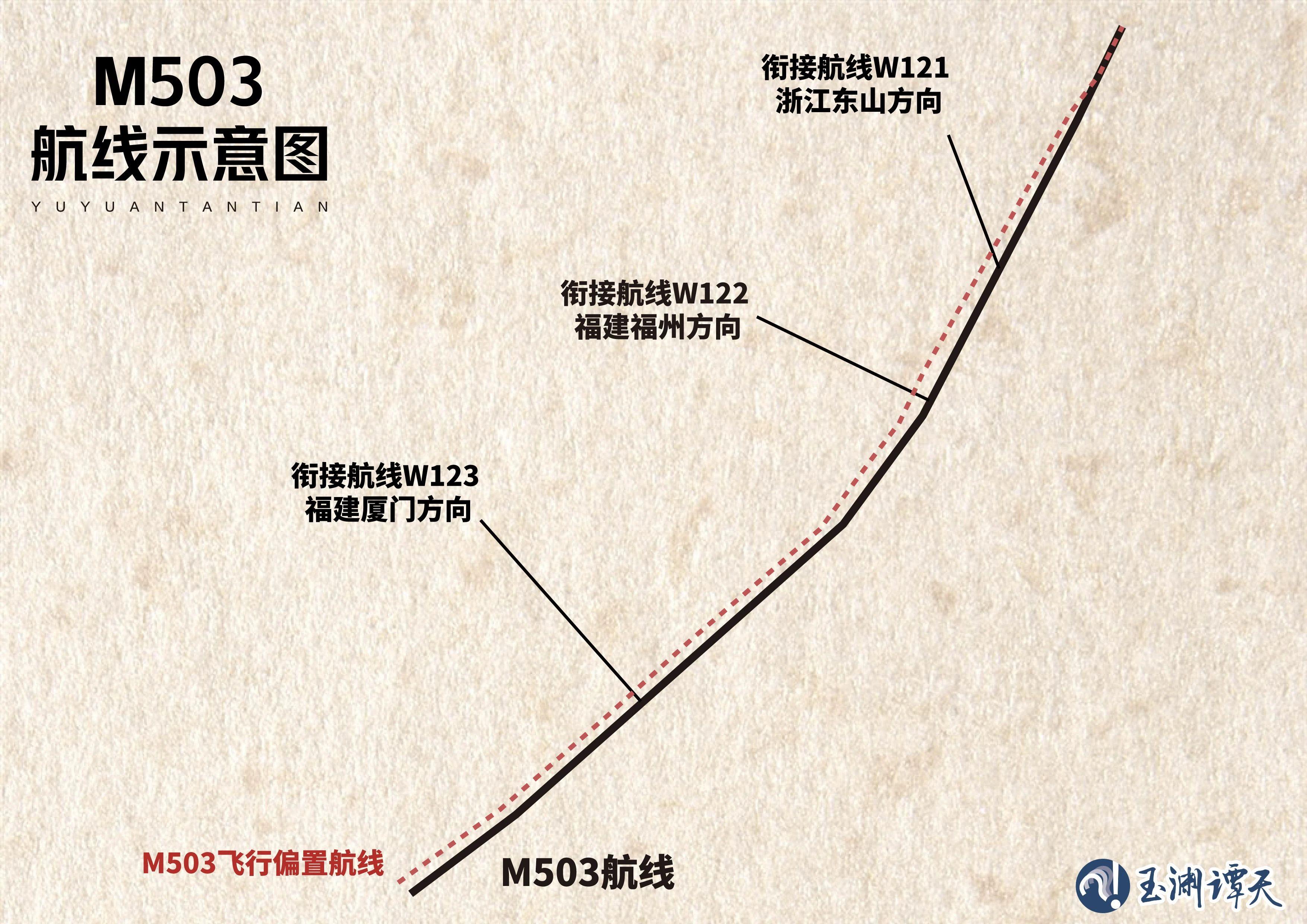 今年1月,民航局宣布,取消M503航线自北向南运行的飞行偏置措施。这一次,民航局又宣布启用M503航线W122、W123衔接线由西向东运行。