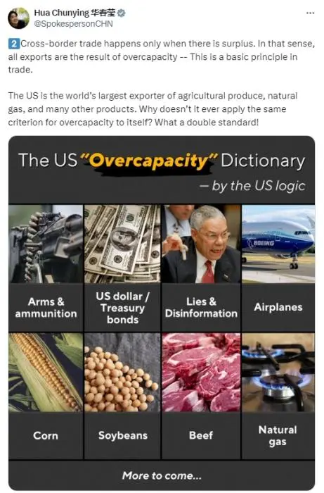 “美国是世界上最大的农产品、天然气和许多其他产品出口国。为什么不把同样的产能过剩标准应用到自己身上呢?真是双标!”华春莹反问道。