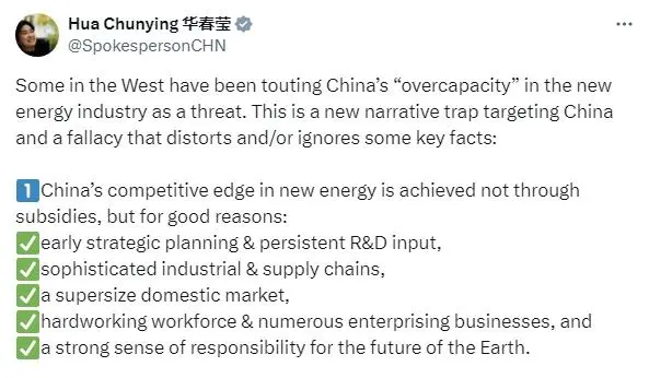 接着,华春莹继续发文称,西方一些人一直将中国新能源行业的“产能过剩”鼓吹为威胁,这是针对中国新的叙事陷阱,是歪曲或忽视一些关键事实的谬论:中国在新能源领域的竞争优势不是通过补贴实现的,而是有充分理由的,这包括早期的战略规划和持续的研发投入、完善的产业链和供应链、超大规模的国内市场、勤勉的劳动力和众多进取的企业,以及对地球未来负有的强烈责任感。
