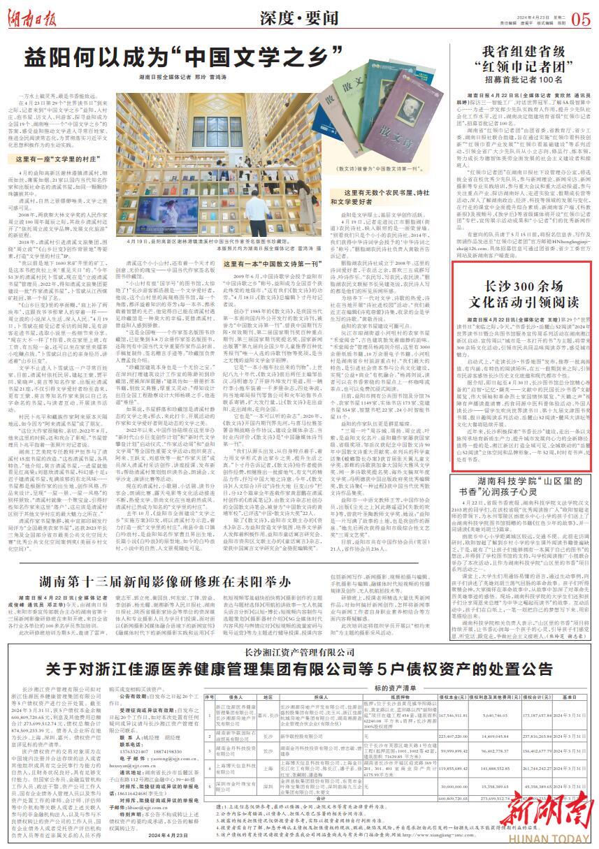 据介绍,即日起至4月30日,长沙图书馆总分馆精心准备的“启智·记忆·撷英——文献中的民国长沙书香”文献展览、伟大领袖和革命烈士家国情怀展览、“天籁之声”视障有声播读邀请赛、药食同源中医科普体验活动、外国人读长沙——留学生欢庆世界读书日、第十九届文津图书奖书展、假日趣阅读系列活动、岳麓山52阅读·麓风大讲坛等文化大餐将陆续开展。