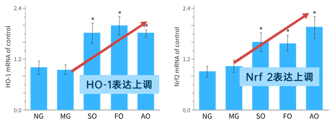 研究人员通过让各组家兔每日摄入藻油(AO),发现相对模型组(MG),经过藻油处理后,家兔的Nrf2和HO-1表达上调,其中Nrf2是调控抗氧化应激的关键转录因子,可以诱导机体产生抗氧化应答;HO-1是一种重要的抗氧化酶,能有效的减少氧化反应。