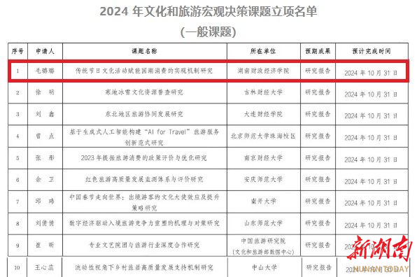 4月21日,中国旅游研究院公布了文化和旅游部2024年文化和旅游宏观决策课题立项名单,湖南财政经济学院人文与艺术学院副院长毛璐璐申报的“传统节日文化活动赋能国潮消费的实现机制研究”课题获批立项,这是湖南财政经济学院首次成功获批此类课题,更是对湖南财政经济学院科学研究服务社会实力的肯定。