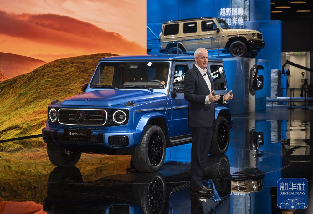 ↑4月25日,在北京中国国际展览中心顺义馆举行的2024北京车展上,梅赛德斯—奔驰集团股份公司董事会成员唐仕凯介绍梅赛德斯—奔驰纯电G级越野车。
