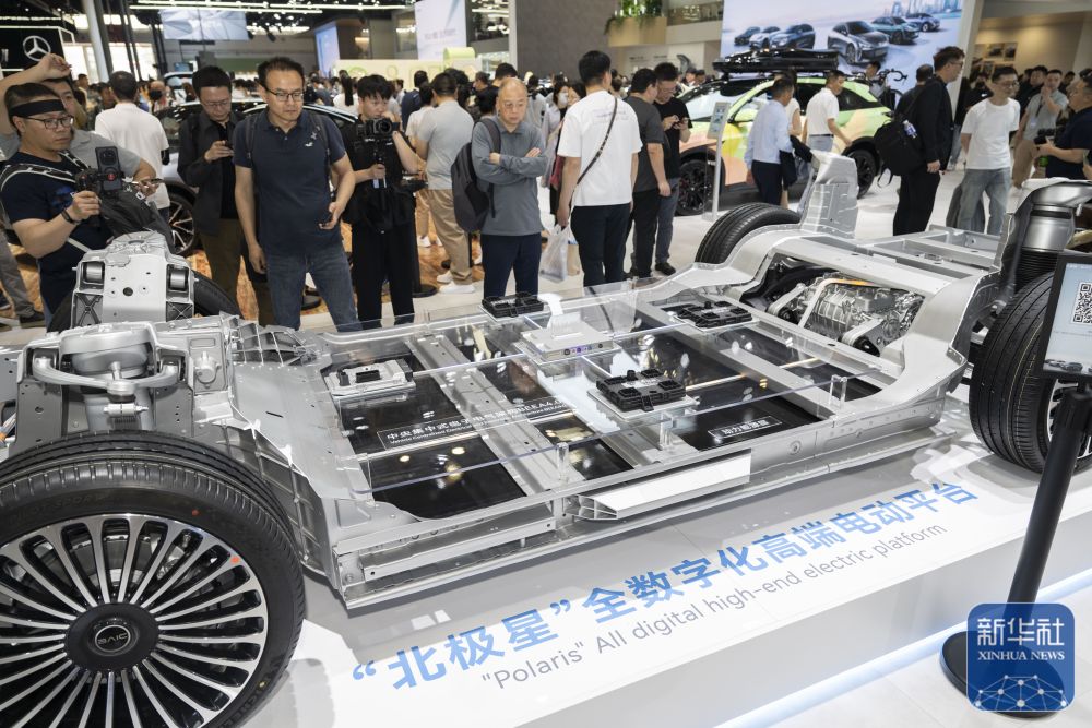 ↑4月25日,在北京中国国际展览中心顺义馆举行的2024北京车展上,观众在北汽集团观看“北极星”全数字化高端电动平台。