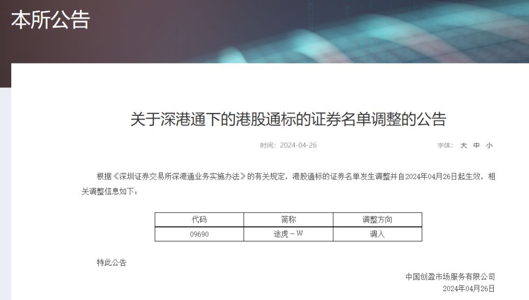 消息面上,4月26日,深交所网站发布的公告显示,根据《深圳证券交易所深港通业务实施办法》的有关规定,港股通标的证券名单发生调整并自2024年4月26日起生效,途虎-W被调入港股通标的证券名单。