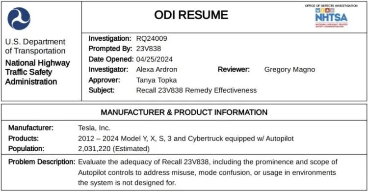 NHTSA表示,调查涵盖美国2012年至2024年生产的配备Autopilot的Model Y、X、S、3和Cyber truck车辆。
