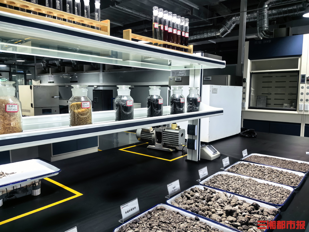 (在大型实验室里,展示了建筑垃圾经过分拣、破碎、磁选、风选等处理后形成的材料。记者 叶竹 摄)