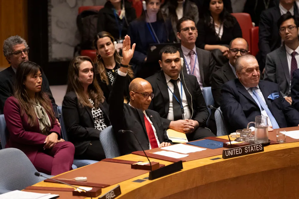 4月18日,在位于纽约的联合国总部,美国常驻联合国副代表罗伯特·伍德(前左)在安理会就一项关于巴勒斯坦申请成为联合国正式会员国的决议草案进行表决时投反对票。新华社记者 谢锷 摄