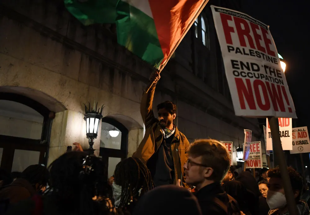 4月24日凌晨,抗议者在美国纽约市哥伦比亚大学参加示威活动。新华社记者 李睿 摄