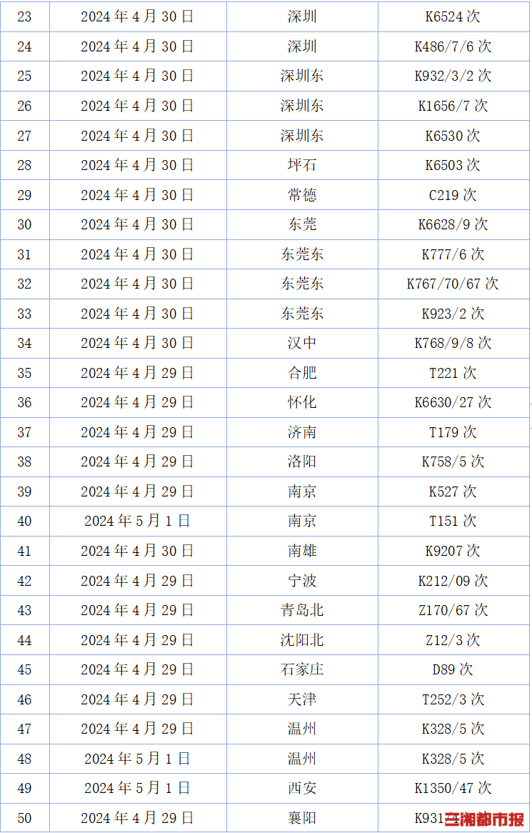三湘都市报·新湖南客户端4月29日讯(全媒体见习记者 李致远)广铁集团4月29日12时通报,根据气象部门消息,近期湖南大部、广东中北部将出现较大范围的大到暴雨,将对铁路运输秩序造成一定的不利影响。基于此,该集团将于4月29日至5月1日期间计划停运京广铁路普速列车62列(具体车次附后),京广、京九普铁和京广高铁的部分列车将出现不同程度晚点。