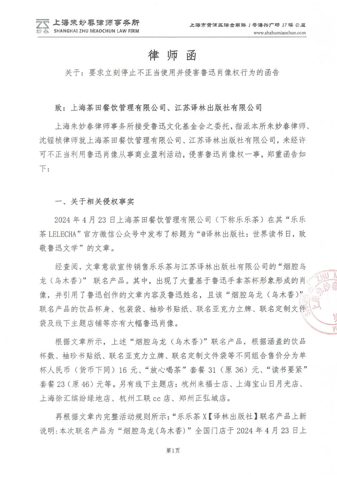 4月29日,潇湘晨报·辣椒财经记者联系到上海朱妙春律师事务所。朱妙春律师告诉记者,4月24日关注到此事后,在鲁迅先生亲属的委托下,已向乐乐茶及江苏译林出版社有限公司(下称江苏译林)发出律师函。