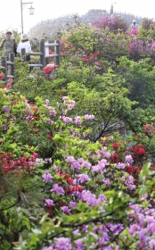 4月28日,游客在郴州资兴市回龙山景区欣赏杜鹃花美景。图/通讯员李科