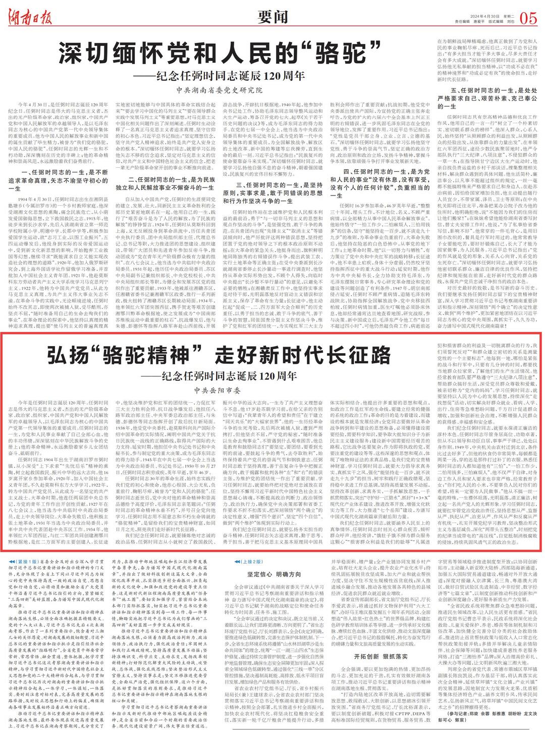 任弼时同志30年的革命生涯,始终忠实践行我们党的初心和使命,他赤心报国、大公无私,负重前行、鞠躬尽瘁,被誉为“党和人民的骆驼”。任弼时同志逝世后,党中央对他的革命精神和崇高品德给予高度评价,毛泽东同志亲笔题词:“任弼时同志的革命精神永垂不朽”,并号召全党向他学习。任弼时同志用不屈意志和不朽生命铸就的“骆驼精神”,是留给我们的宝贵精神财富,如同日月之光,照亮我们走好新时代长征路。