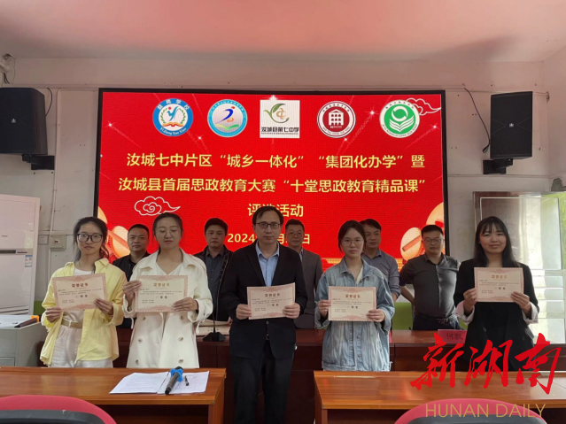 教学比武结束后,全体教师齐聚会议室举行颁奖仪式,汝城七中党支部书记谭建亮宣布了本次思政教育大赛比赛结果,参会领导为参赛教师颁发荣誉证书。
