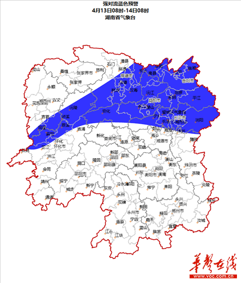 华声在线·新湖南客户端4月13日讯(记者 赵瞳铱 通讯员 林城)湖南省气象台4月13日06时发布暴雨黄色预警:预计13日08时至14日08时,长沙东部、岳阳、常德、张家界东南部、益阳、怀化东北部部分地区将出现暴雨,局地大暴雨,并伴有短时强降水、雷雨大风等强对流天气,请加强防范。