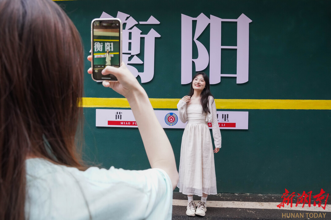 4月30日,来自韶关的游客陈小诺和同学结伴来到来到衡阳市珠晖区保卫里景区“打卡”。湖南日报全媒体记者 成俊峰 摄