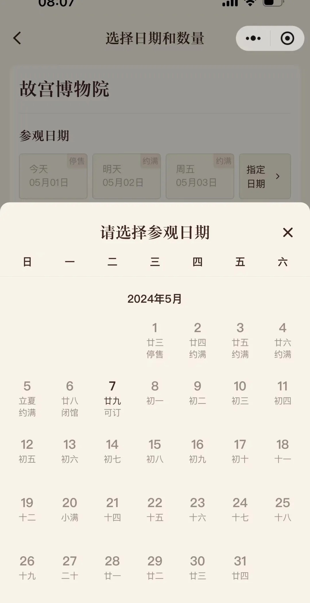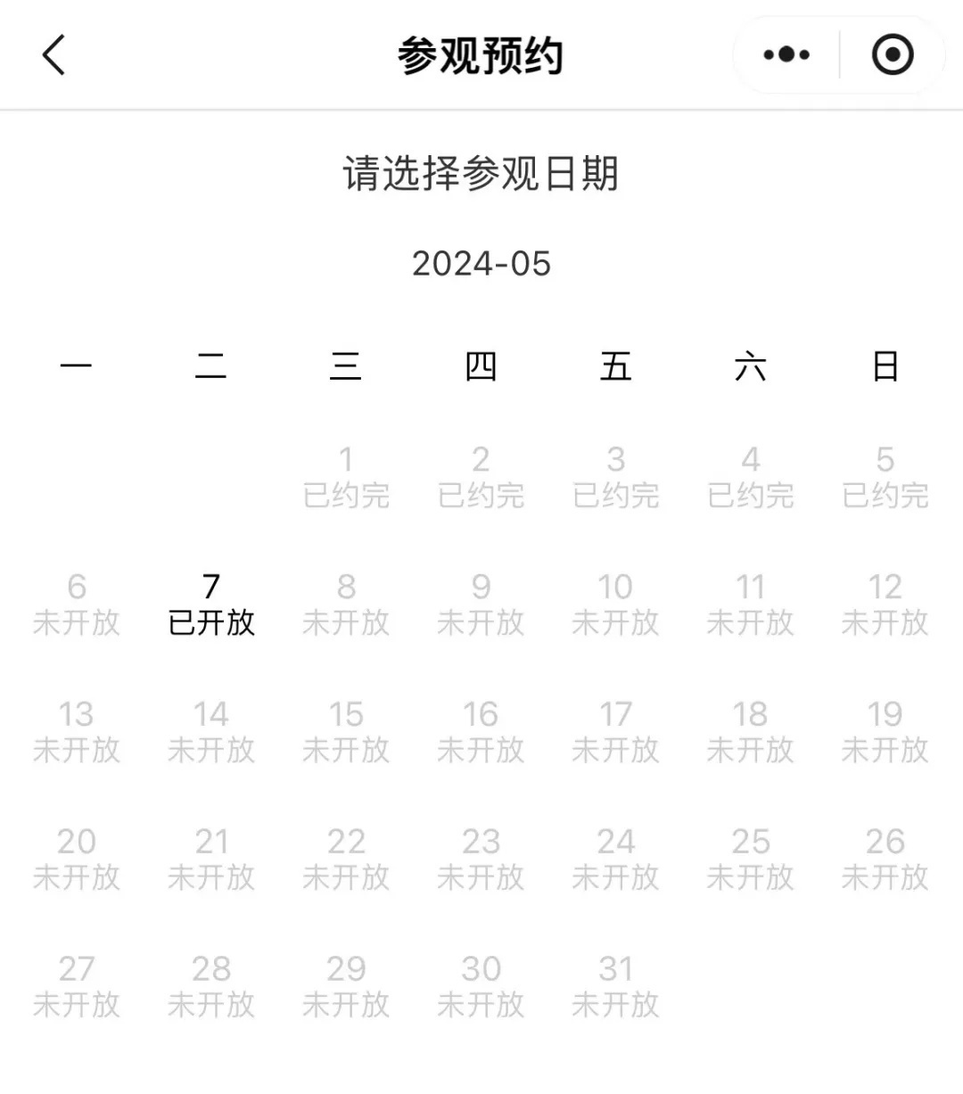5月1日-5日,7日,中国国家博物馆参观预约显示约满。