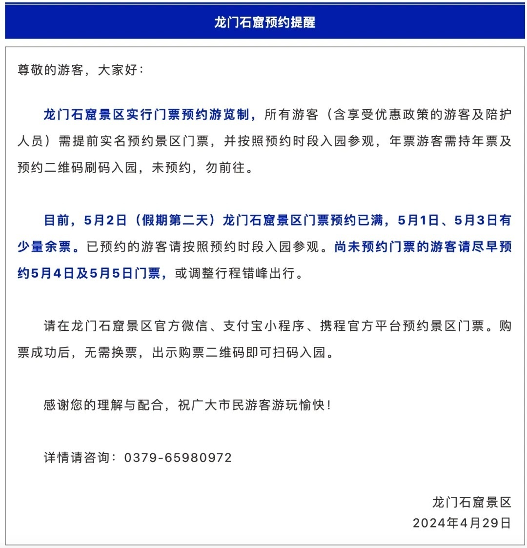 龙门石窟景区:5月2日的门票预约也已满,5月1日和5月3日还有少量余票。