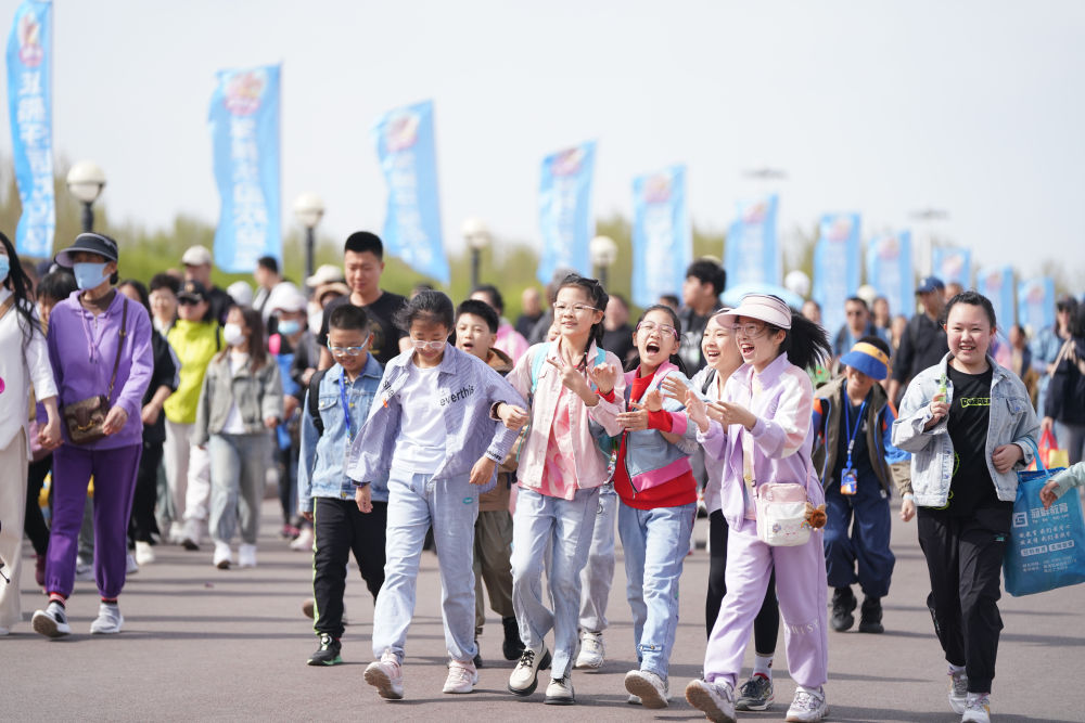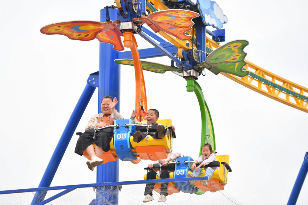 ↑5月1日,小朋友在位于哈尔滨市的黑龙江省森林植物园露营区玩耍。新华社记者 王松 摄