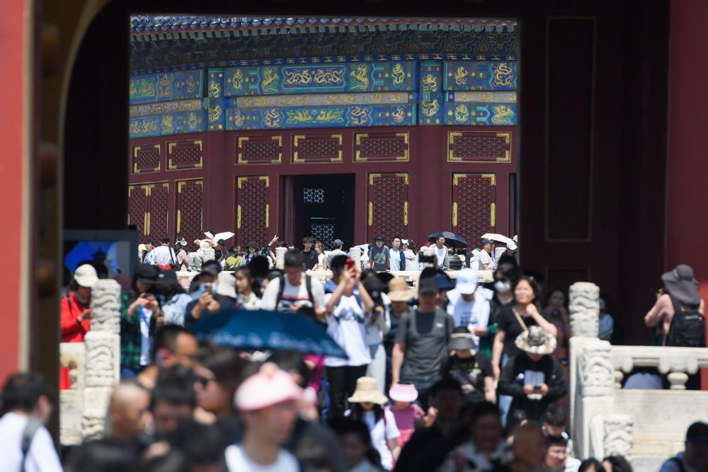 ↑5月2日,游客在北京天坛公园内排队前往祈年殿参观。新华社记者 鞠焕宗 摄