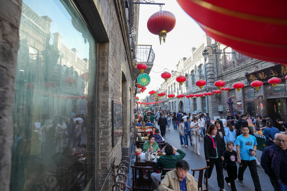 ↑5月1日,游客在哈尔滨中华巴洛克历史文化街区游览。新华社记者 王建威 摄
