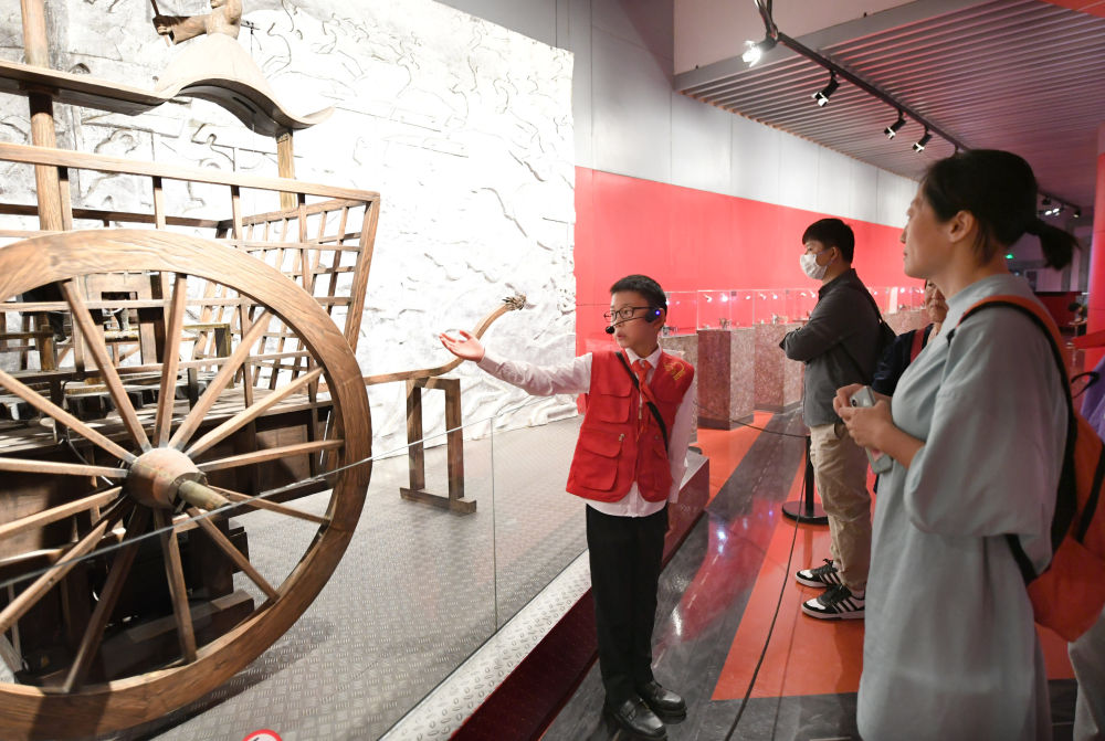 ↑5月2日,在北京汽车博物馆,“小小讲解员”(左一)为游客介绍展品。新华社记者 任超 摄