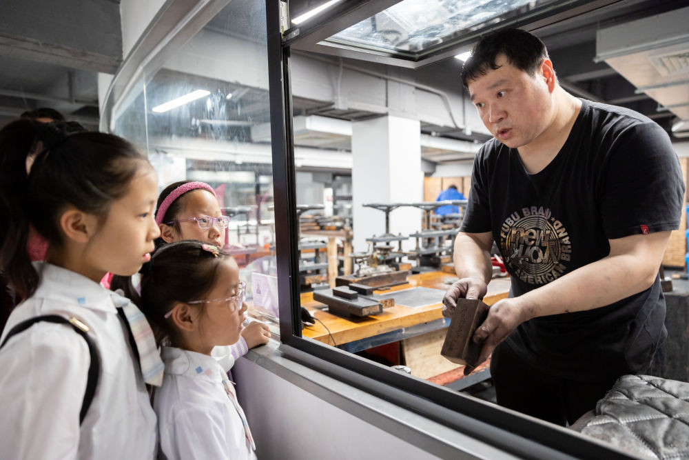 ↑5月2日,在上海文化旅游地标“笔墨宫坊”,制墨工匠师傅为儿童讲解相关知识。新华社记者 王翔 摄