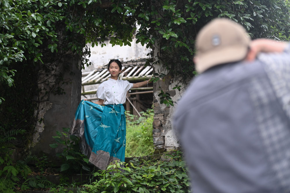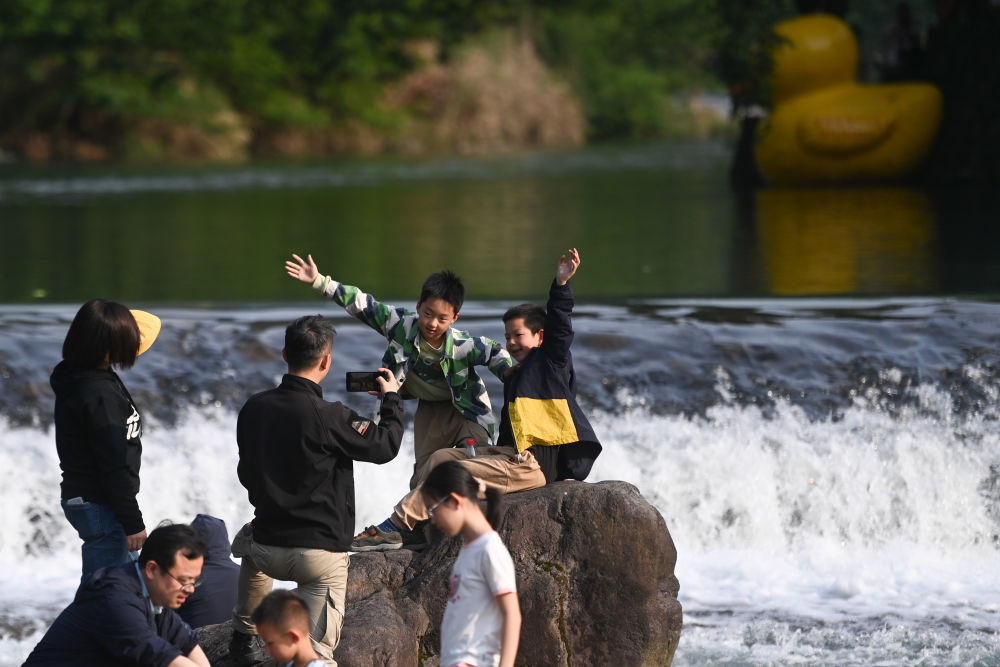 ↑5月2日,游客在浙江省桐庐县富春江镇茆坪村打卡拍照。新华社记者 黄宗治 摄