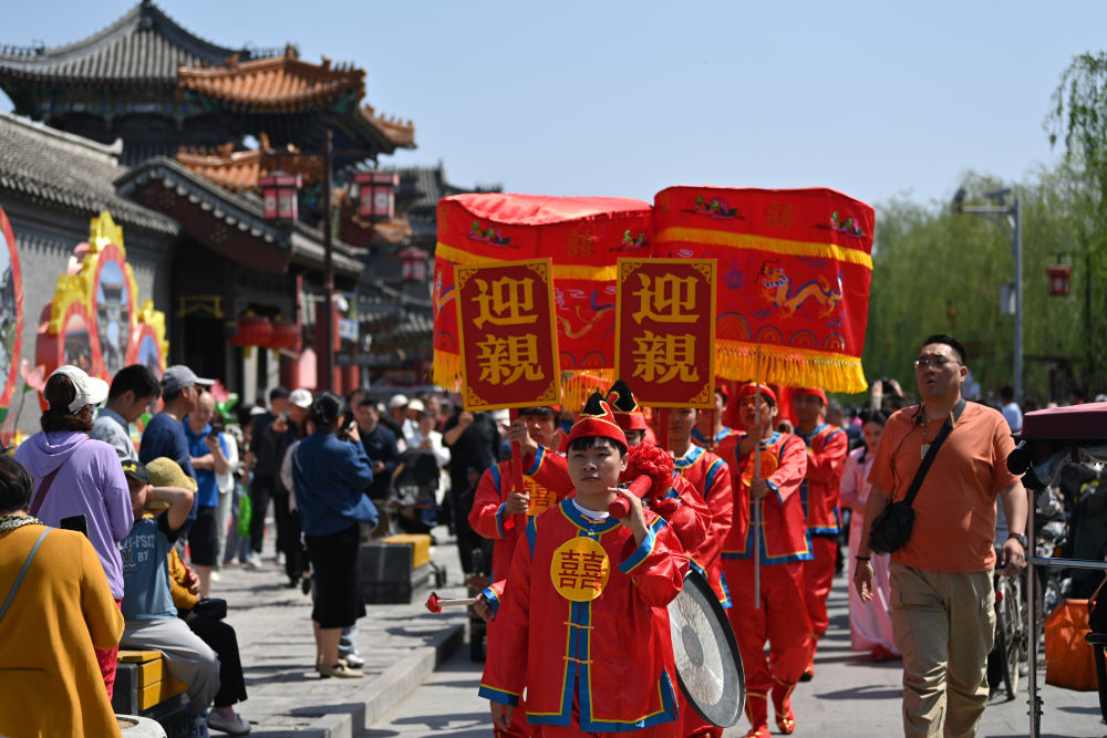 ↑5月2日,天津市西青区文旅局组织的“石府良缘”沉浸式民俗文化演出在杨柳青古镇石家大院景区上演。这是演出人员在进行娶亲表演。新华社记者 李然 摄
