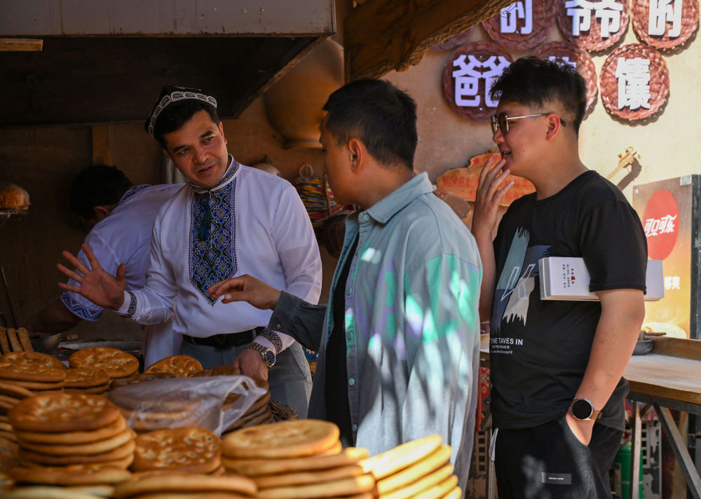 ↑5月2日,游客在新疆喀什古城景区内选购特色食品。新华社记者 陈朔 摄