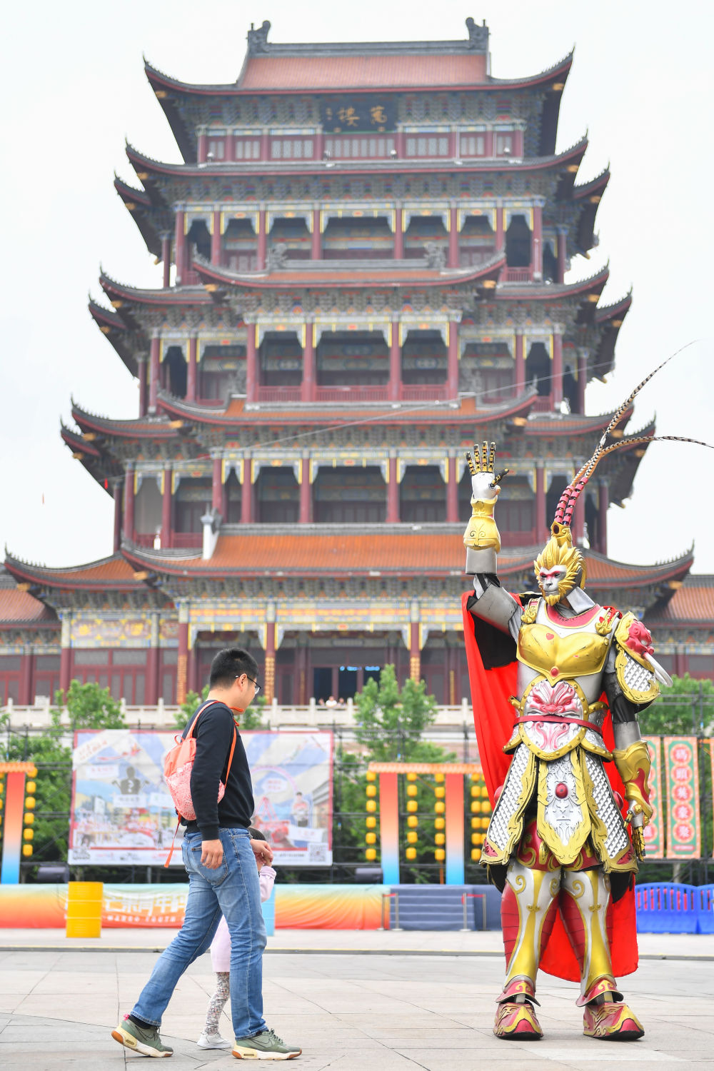 ↑5月2日,游客在湖南省湘潭市雨湖区万楼青年码头游玩。新华社记者 陈泽国 摄