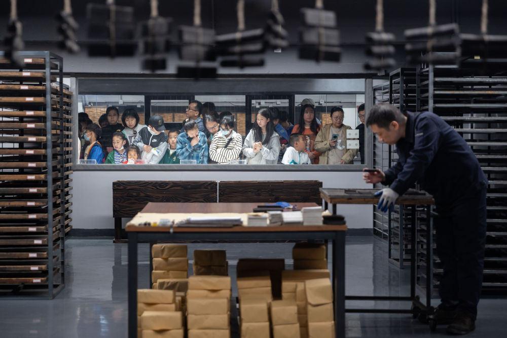 ↑5月2日,游客在上海文化旅游地标“笔墨宫坊”参观了解制墨工序。新华社记者 王翔 摄
