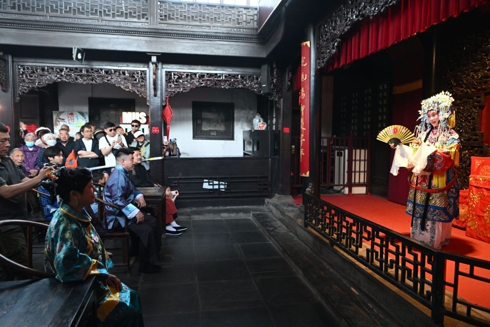 ↑5月2日,天津市西青区文旅局组织的“石府良缘”沉浸式民俗文化演出在杨柳青古镇石家大院景区上演。这是演出人员在进行京剧表演。新华社记者 李然 摄