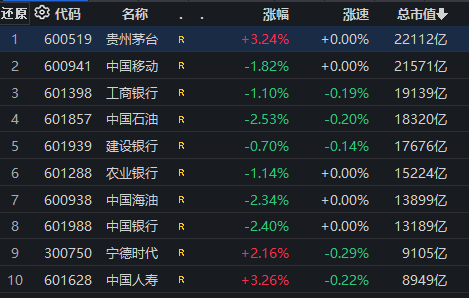 贵州茅台盘中走强,收盘大涨3.24%,市值达2.2万亿元,反超中国移动,再次位居A股市值第一。