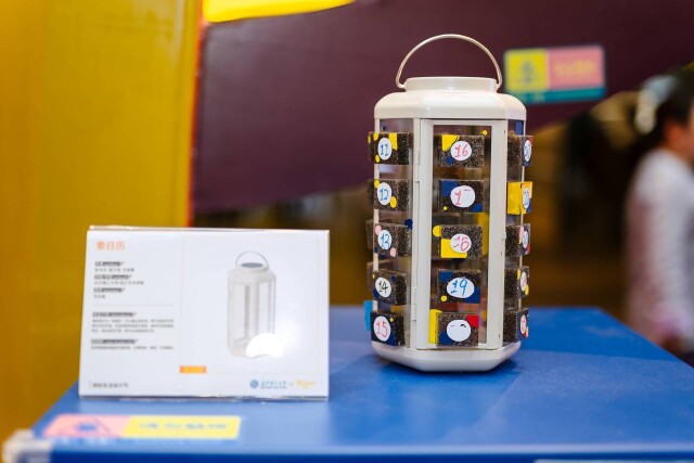 在展览现场吸引了不少游客拍照的“俄罗斯‘咖’块”,是由咖啡渣、过期奶粉,通过生态粘合剂粘合而成。涂上环保颜料后,这件作品更显趣味性和装饰性。“用户可以根据他们的喜好,通过磁吸的方式将咖啡渣积木嵌入废旧相框。这件作品既可以是装饰品也可以是玩具。”设计者之一的赵令仪同学介绍。
