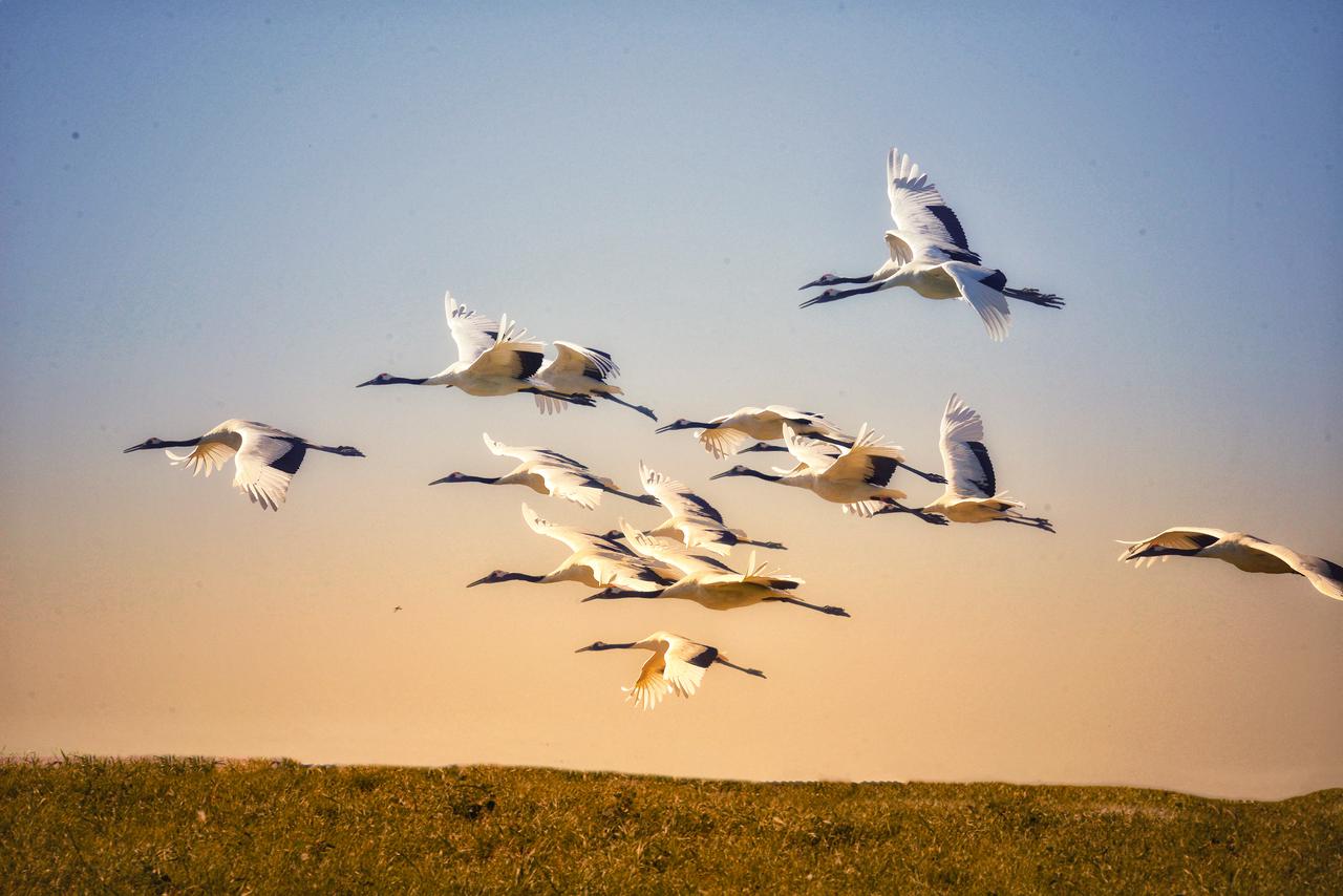 扎龙国家级自然保护区内,丹顶鹤在湿地上空自由翱翔