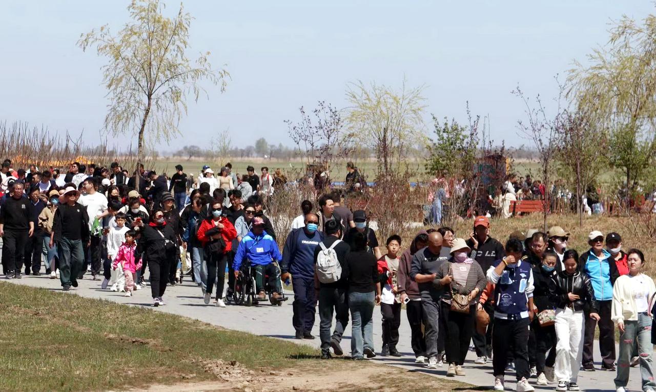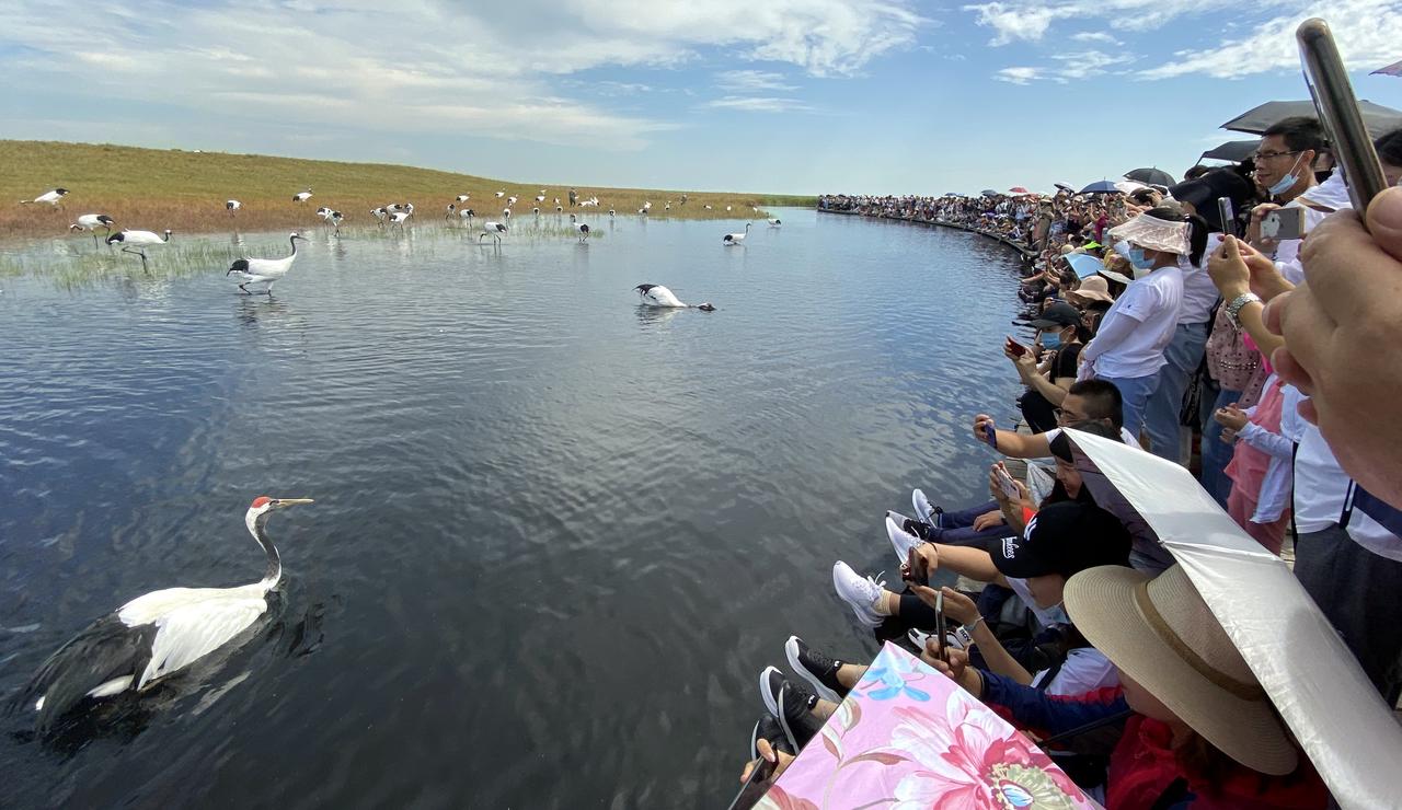 前往湿地观鹤的游客络绎不绝