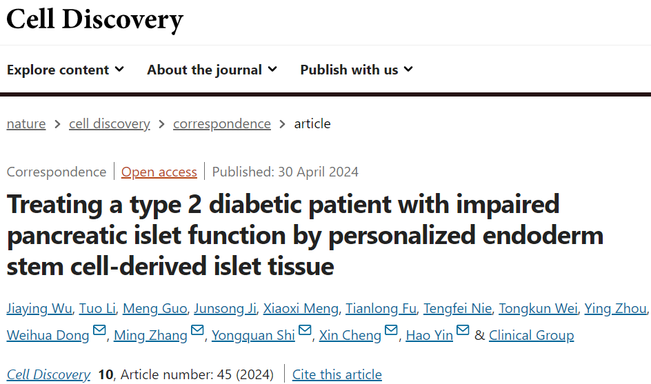 据微信公众号“上海长征医院”7日消息,4月30 日,海军军医大学第二附属医院(上海长征医院)殷浩教授团队联合中国科学院分子细胞科学卓越创新中心程新教授团队,在权威杂志Cell Discovery(中科院1区,IF=33.5)在线发表了题为“Treating a type 2 diabetic patient with impaired pancreatic islet function by personalized endoderm stem cell-derived islet tissue”的研究成果。这是国际上首次利用干细胞来源的自体再生胰岛移植,成功治愈胰岛功能严重受损糖尿病的病例报道。目前该患者已彻底脱离胰岛素长达33个月。