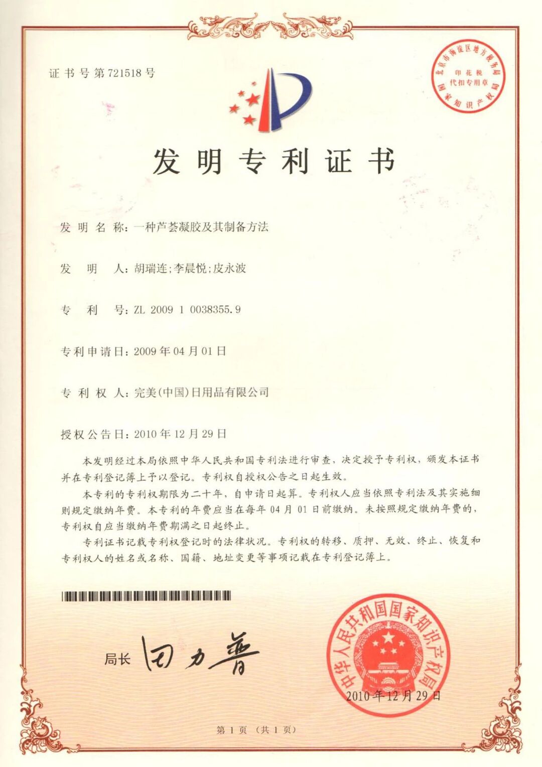 名称为“一种芦荟凝胶及其制备方法”的专利技术应用在完美芦荟胶产品中。