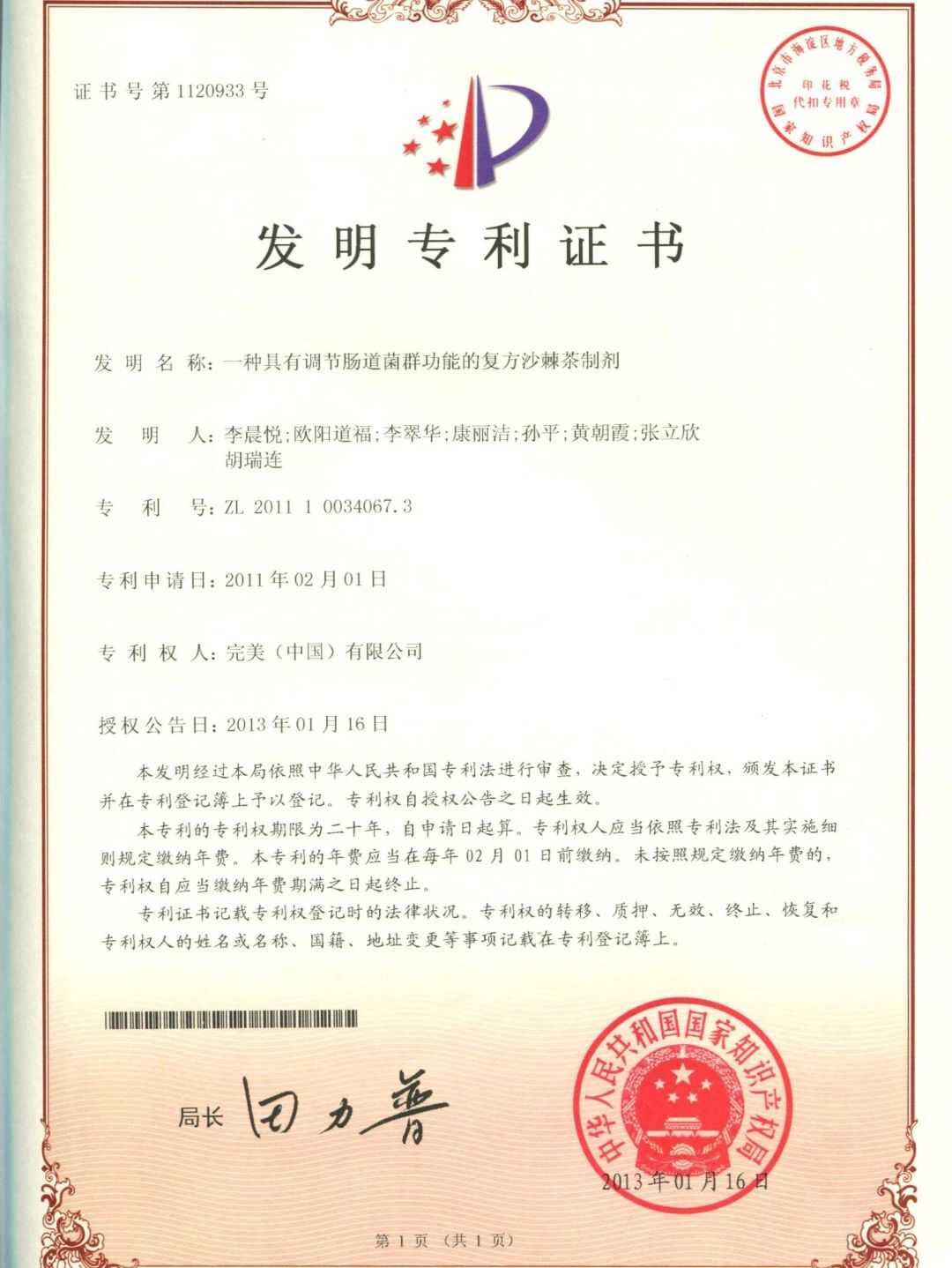 名称为“一种具有调节肠道菌群功能的复方沙棘茶制剂”的专利应用在低聚果糖沙棘茶(固体饮料)产品中。