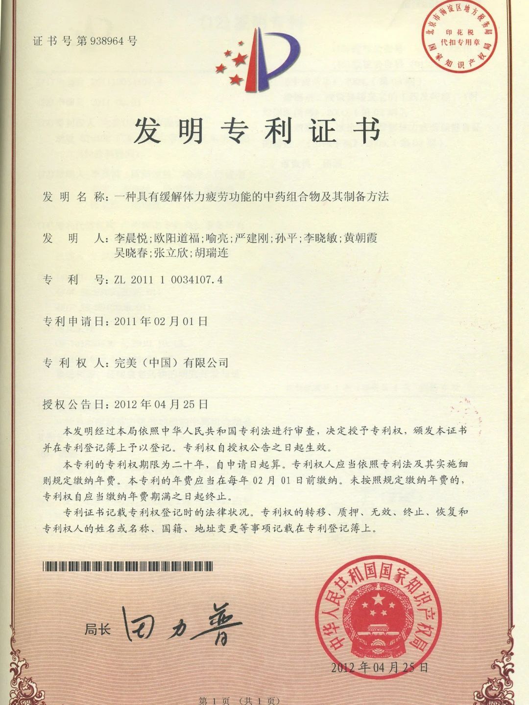 名称为“一种具有缓解体力疲劳功能的中药组合物及其制备方法”的专利应用在完美牌健扬胶囊产品中。