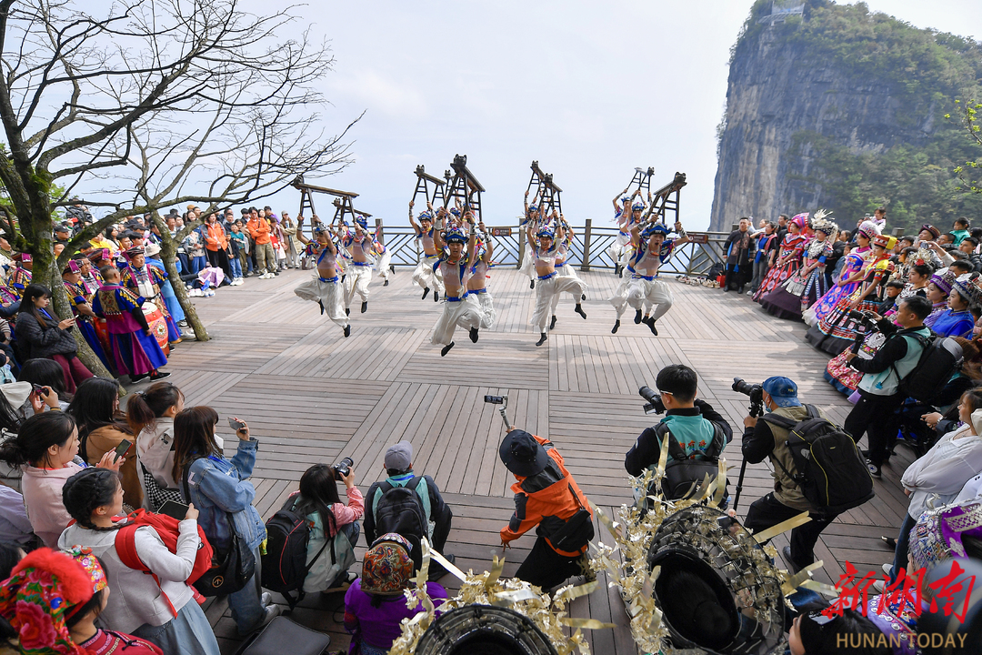 5月1日,在张家界天门山景区举行的“五一云端非遗民俗秀”活动中,舞蹈演员为游客表演土家族男子群舞《逗虎》。 向韬 摄