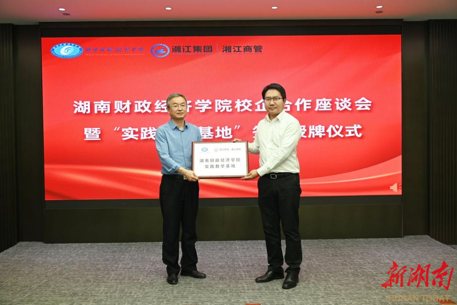 黄国华、陈珂分别代表校企双方进行校企合作签约,刘钟理为湖南湘江新区发展集团有限公司教学实践基地授牌。